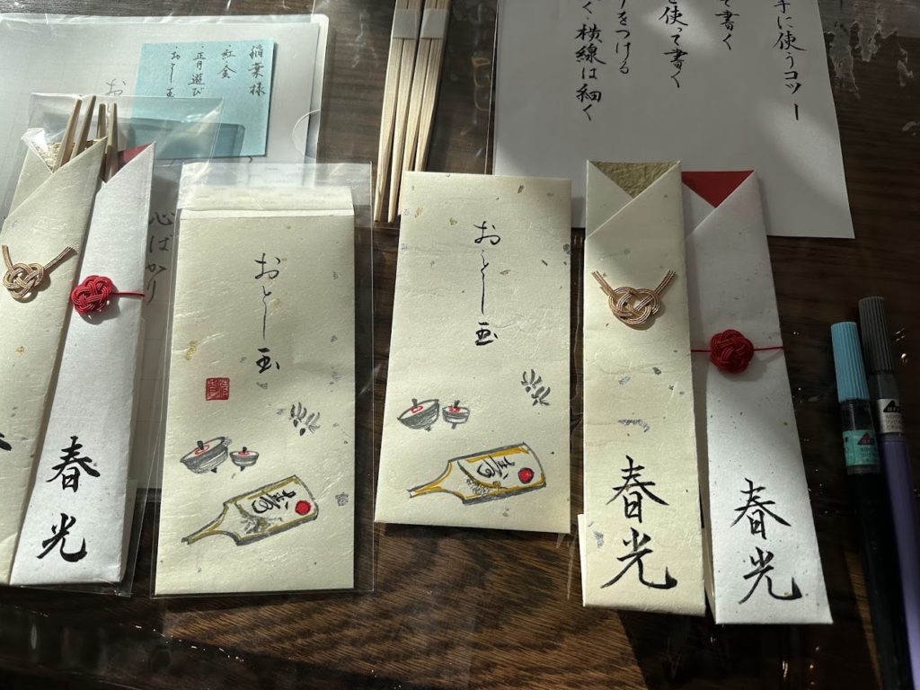 今回のワークショップはのし袋と箸袋を作りました。筆ペンでしたが、一生懸命1つ1つの字に向き合えて、とても有意義な時間となりました。先生の字、とても好きです。 模写しようとしてもなかなかできませんでした。あんなふうにさらさらときれいな字がかけたら気持ちよいだろうな~